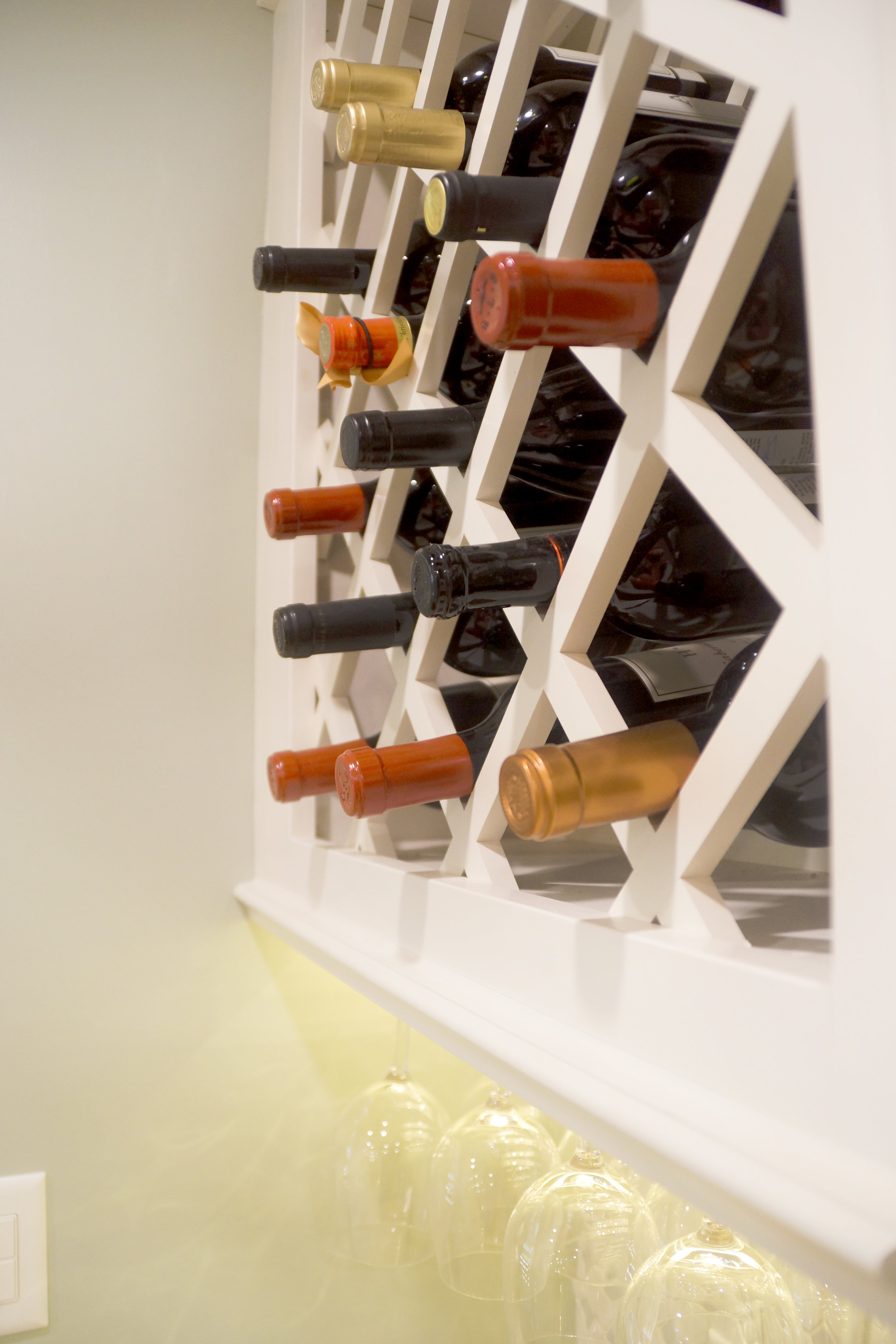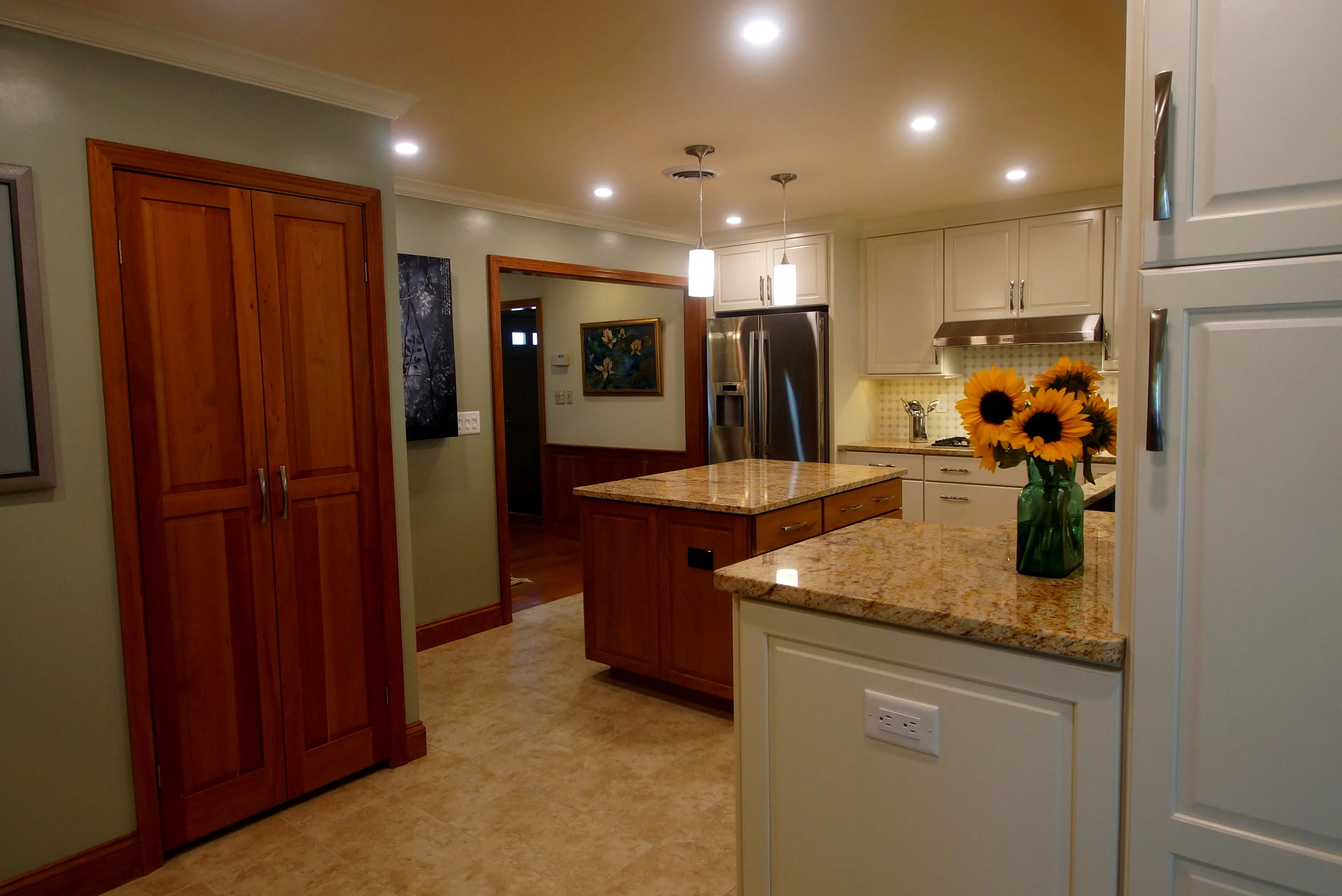 Before the remodel, this kitchen had a mix of custom cherry cabinets that had been added to a white and blue painted L-shaped kitchen with a peninsula. The homeowners had added a great room adjacent to the kitchen, but the kitchen's layout did not connect well to this well used space. The peninsula created a pinch point in the main kitchen space and cut off a portion of the storage area from the main prep area. For the remodel, we captured 2 feet of space from an adjacent office and infilled one set of french doors. This provided additional square footage and wall space for the kitchen cabinetry. The peninsula was removed and replaced with an elevated base cabinet at the end of a long ivory colored cabinetry run. We re-used existing cherry cabinets at the bar area and floated a new cherry island in the middle of the space. To keep an open foot path, the wall oven and microwave were tucked into improperly used space over an existing stair to the basement. The kitchen now boasts expansive counters, designated prep and storage areas, and ample entertaining space that connects to the great room through a large expanded opening over the sink and through a set of french doors.